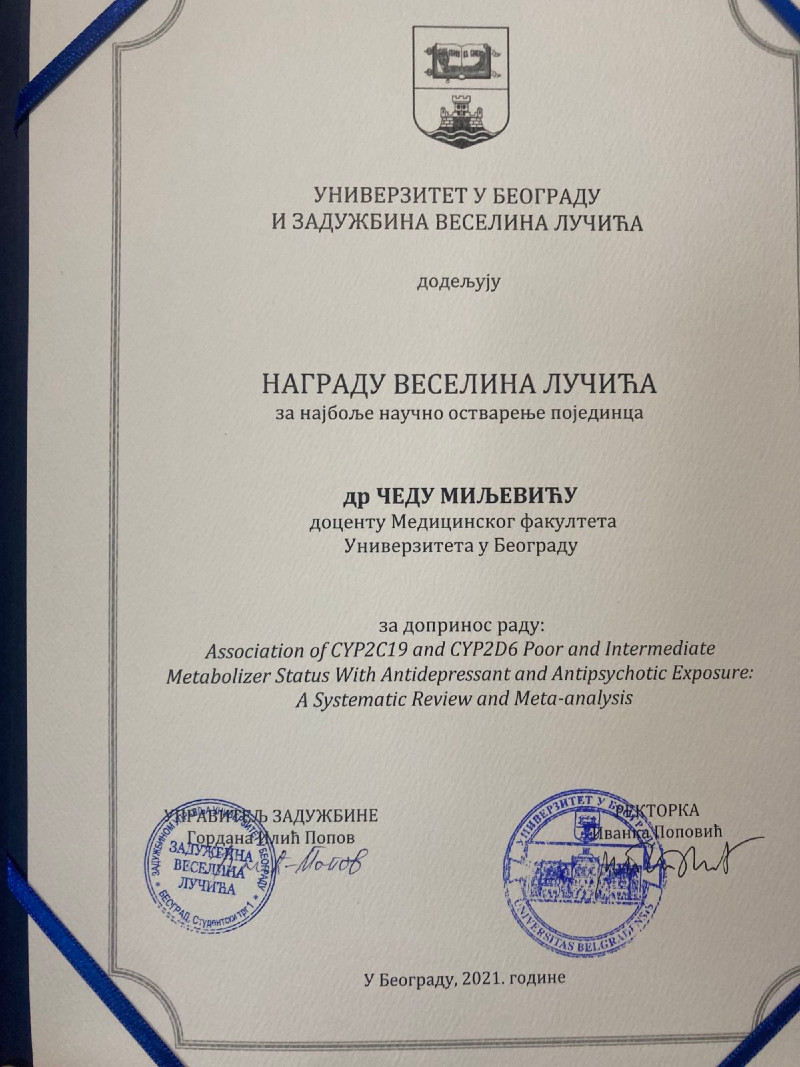 Доц.др Чедо Миљевић je 24.08.2021 , као коаутор рада „Association of CYP2C19 and CYP2D6 Poor and Intermediate Metabolizer Status With Antidepressant and Antipsychotic Exposure: A Systematic Review and Meta-analysisˮ објављеног у JAMA Psychiatry 2021; 78(3) 270-280. добио награду за најбољи рад Београдског универзитета. Награда му је уручена, заједно са свим ауторима, на дан задужбинара у Ректорату БУ. Ове године су додељене три награде за најбољи научни рад од којих је овај једини из подручја биомедицинских наука.