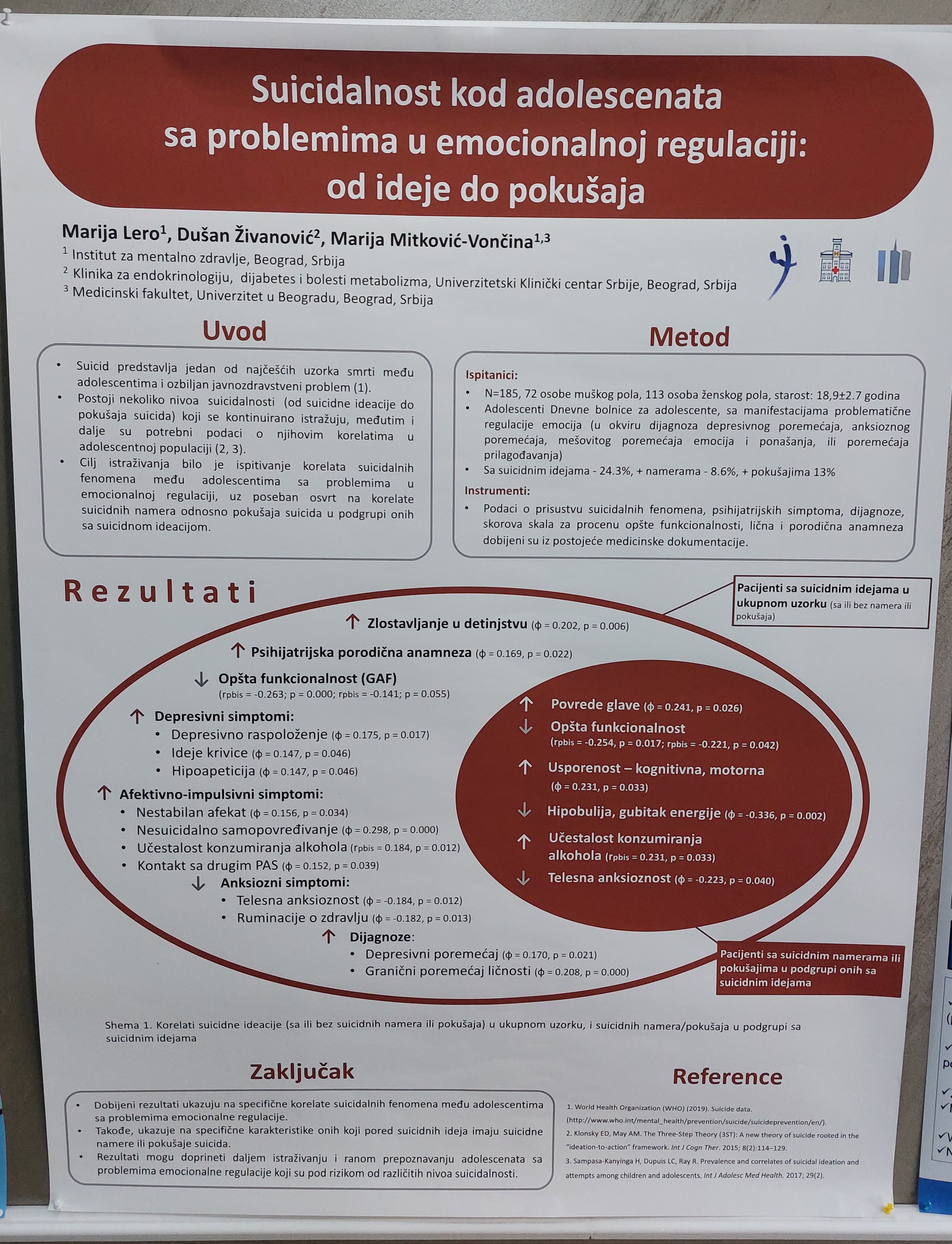 На VI конгресу Друштва за дечју и адолесцентну психијатрију и сродне струке Србије (ДЕАПС) који је одржан у периоду од 26-28.5.2022. године у Врњачкој Бањи, др Марија Леро презентовала је истраживање у виду постера под називом „Суицидалност код адолесцената са проблемима у емоционалној регулацији: од идеје до покушаја“, чији аутори су и др Душан Живановић и клинички асистент др Марија Митковић Вончина. Том приликом постер је освојио награду, и то друго место у оквиру постер презентација.