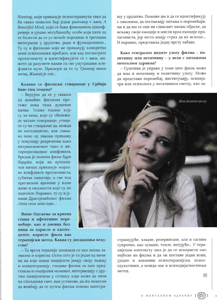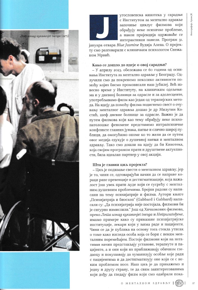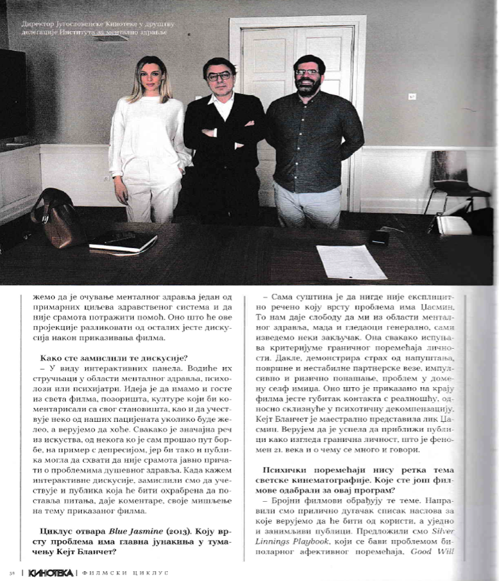Априла ове године се обележава 60 година од оснивања Института за ментално здравља у Београду. Одлучили смо да покренемо неколико активности како би обележили велики јубилеј.С обзиром да се већ извесно време у дневној болници и на клиничким одељењима за одрасле и адолесценте у Институту, употребљава филм као један од терапијских метода дошли смо на идеју да помоћу филма подигнемо свест о очувању менталног здравља. Биће представљени филмови који обрађују неке психопатолошке феномене те да се преко психичких стања, конфликата главних јунака шира публика упозна са психичким поремећајима и менталним здрављем уопште. У сарадњи са Југословенском кинотеком сваког последњег уторка у месецу биће организована пројекција филмова који обрађују психолошко-психијатријску проблематику, а након пројекције ће се одржати интерактивни панели. Програм почиње 31 јануара у 19h приказивањем филма "Blue Jasmine" Вудија Алена.