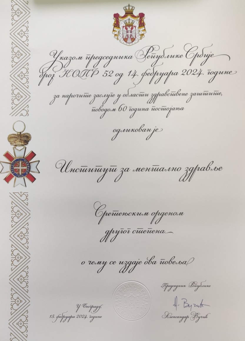 Институту за ментално здравље је додељен сретењски орден II реда за нарочите заслуге у области здравствене заштите поводом 60 година постојања