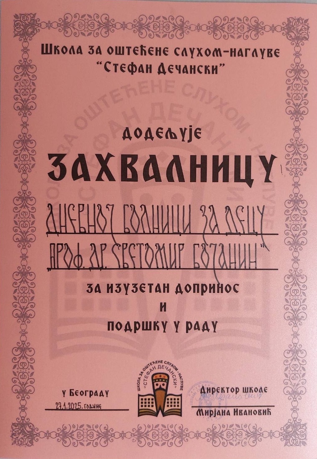 Директорка школе за оштећене слухом-наглуве "Стефан Дечански" госпођа Мирјана Ивановић уручила је захвалницу Дневној болници за децу „Проф. Др Светомир Бојанин" на Институту за ментално здравље за изузетан допринос и подршку у раду школе.