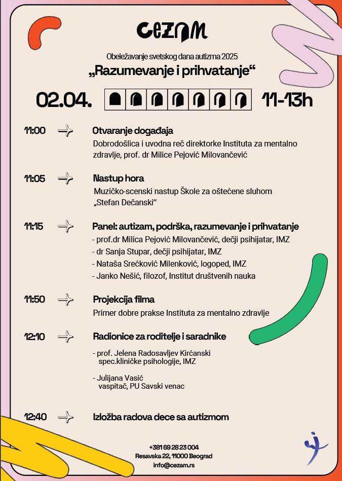 Институт за ментално здравље традиционално организује низ активности поводом Светског дана особа са аутизмом. Ове године, догађај ће се одржати у просторијама Центра за младе ЦЕЗАМ, а биће посвећен подизању свести о важности прихватања и разумевања деце и особа са аутизмом у нашем друштву.